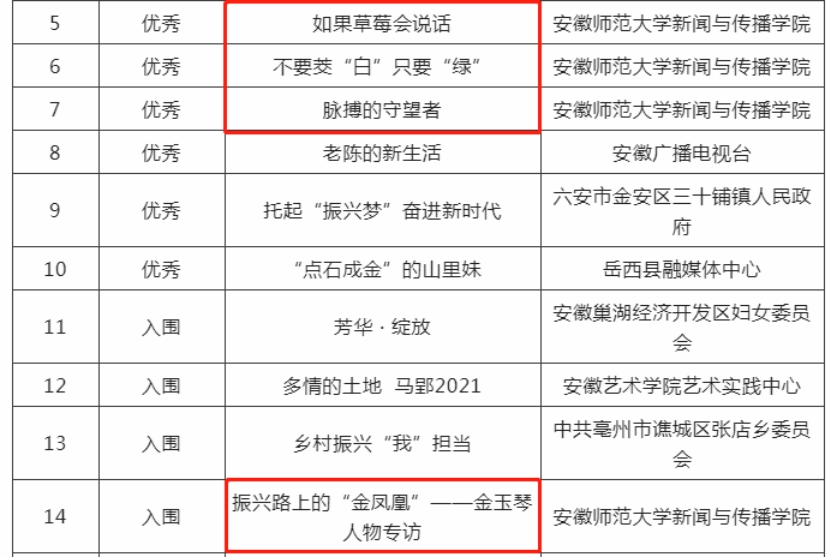 荣获优秀奖的作品《如果草莓会说话》由以王雅文为代表的5名2021级新闻与传播专硕研究生以及两名2019级摄影专业的本科生拍摄而成,传递出乡村振兴的背景下,合肥长丰县凭借草莓行业的发展和创新而走上脱贫致富道路的故事。同样获得优秀奖的作品《不要“茭”白只要“绿”》,由2019级新闻学和摄影专业的金梦婷、司皓权、许准及其团队奔赴安徽省安庆市岳西县拍摄而成,通过绿茵高山蔬菜合作社的负责人王家旺之口,讲述了田间地头的秸秆经过回收利用蜕变成纯天然、无污染的绿色工艺品和有机肥的故事。由2020级网络与新媒体专业的郭昊团队拍摄而成的《脉搏的守望人》同样获得优秀奖,作品讲述了40岁的乡村医生陈科将18年的时间奉献在肥东县石塘镇大孟村的卫生院,为留守在村里的老人们看病治疗或者上门问诊,成为老人们的“脉搏守望人”。