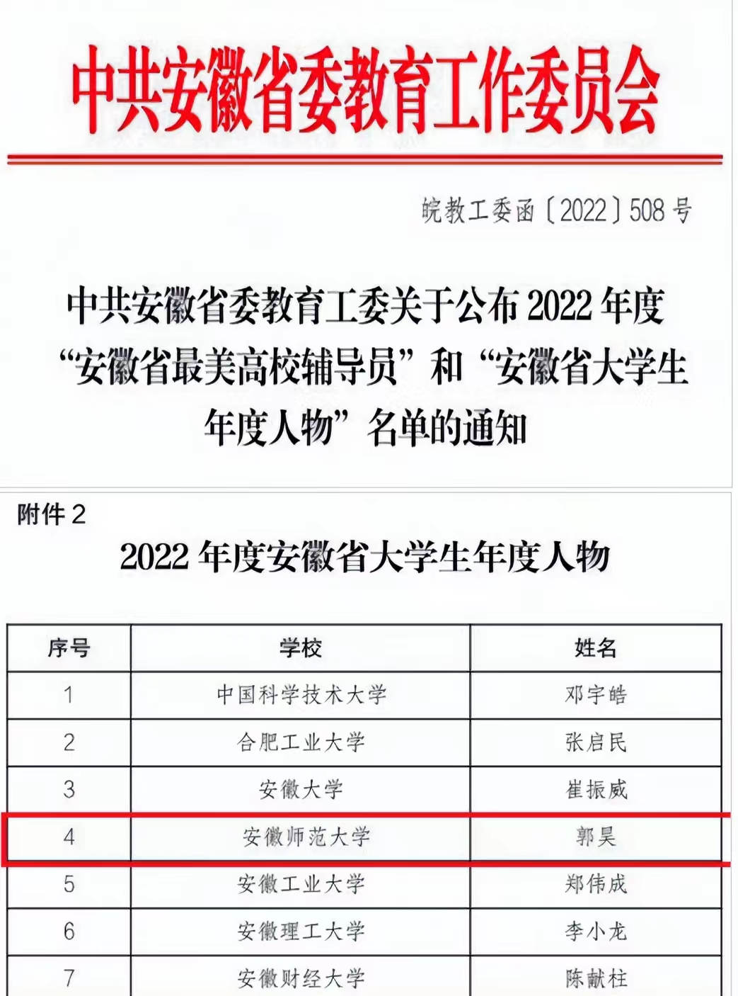 本网讯(文/张春燕)日前,中共安徽省委教育工委公布了2022年度“安徽省大学生年度人物”评选结果,学院2020级网络与新媒体专业本科生郭昊同学荣获2022年度 “安徽省大学生年度人物”荣誉称号。