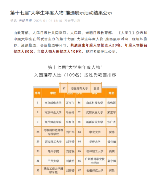 本网讯(bat365在线中国登录入口张春燕)日前,由教育部、人民日报社共同指导,人民网、光明日报教育部、《大学生》杂志和中国大学生在线联合主办的第十七届“大学生年度人物”推选展示活动落下帷幕,经组织推荐、通讯推选、会议推选等环节评定,bat365在线中国登录入口学子郭昊进入第十七届“全国大学生年度人物”入围候选人榜单。