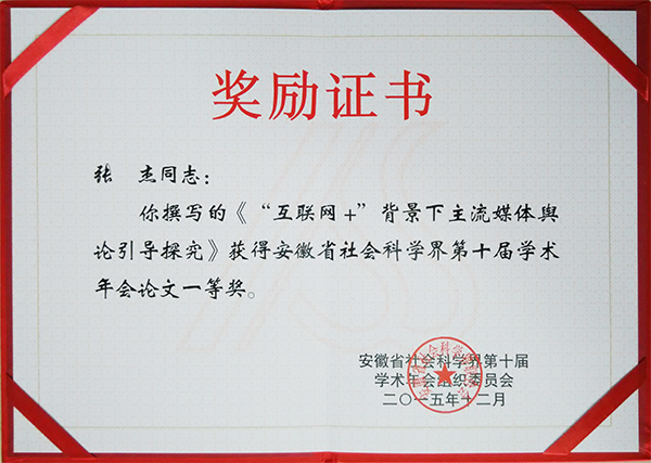 2015年12月26日,安徽省社会科学界第十届学术年会在省委党校学苑大厦隆重举行,bat365在线中国登录入口2013级硕士研究生张杰获得年会论文一等奖,并在“软文化与大战略”专场作论文交流汇报。本篇论文是3篇一等奖论文中唯一一篇由学生撰写的论文,也是获奖论文中唯一一篇新闻传播类论文。