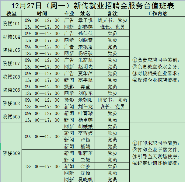 本次招聘会的时间专门安排在研究生考试结束后的第二天,主要是为了照顾本学期在外实习和备考研究生招生考试的同学,帮助他们抓住秋招的尾巴。经过多次商讨,一份细致的工作方案也在摸索中变得清晰,逐渐成型。联系企业、人员调动、场地申请、宣发准备、为来校企业准备餐券与停车券……各项工作随之有序展开。万事俱备,东风即来。