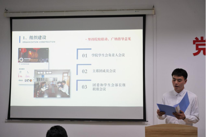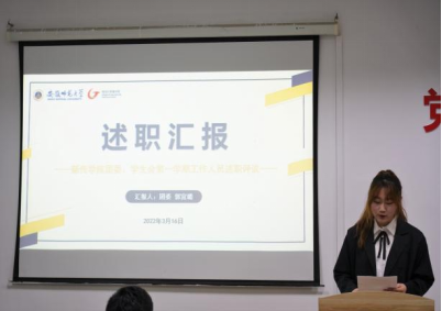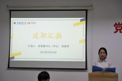 随后,院团委学生副书记胡晨玥和郭宜璐进行述职报告。她们从组织建设、工作成效、学习情况三个方面进行了汇报,如在组织建设上,建立线上联络群聊,线下例会开展工作;在工作成效上,成功组织迎新生活动,第50届运动会的前后期各项工作,第二届学团代会等等。