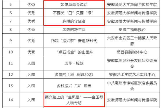 2022年3月17日,由安徽省文联、安徽省影视家协会主办的“皖”美乡村——安徽省乡村振兴短视频大赛公布了20部拟入选作品名单,其中包括10部优秀作品和10部入围作品。4月19日,这20个视频作品在安徽省文联的公众号进行展播。bat365在线中国登录入口共有4部纪实短视频作品入选并参与展播,包括优秀奖作品《如果草莓会说话》《不要“茭”白只要“绿”》《脉搏的守望人》和入围作品《振兴路上的“金凤凰”——金玉琴人物专访》。获奖作品分别由学院摄影、网络与新媒体、新闻学等专业本科生、新闻与传播专业硕士生,在专业采风、广播电视理论与实践、暑期社会实践等课程和实践活动中调研采制而成。