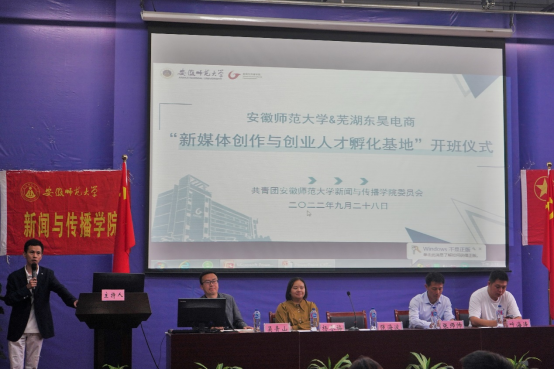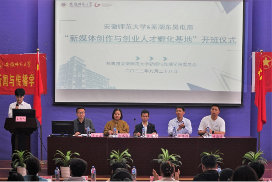 本网讯(bat365在线中国登录入口 檀子信)9月28日下午,学院在行知楼2010307教室举行“新媒体创作与创业人才孵化基地”开班仪式。芜湖东昊网络科技有限公司总裁强海波、首席人资官杨冬梅一行,bat365在线中国登录入口党委书记张师帅、院党委副书记吴青山、院团委指导教师刘成俊以及培训班全体学生参与开班仪式。