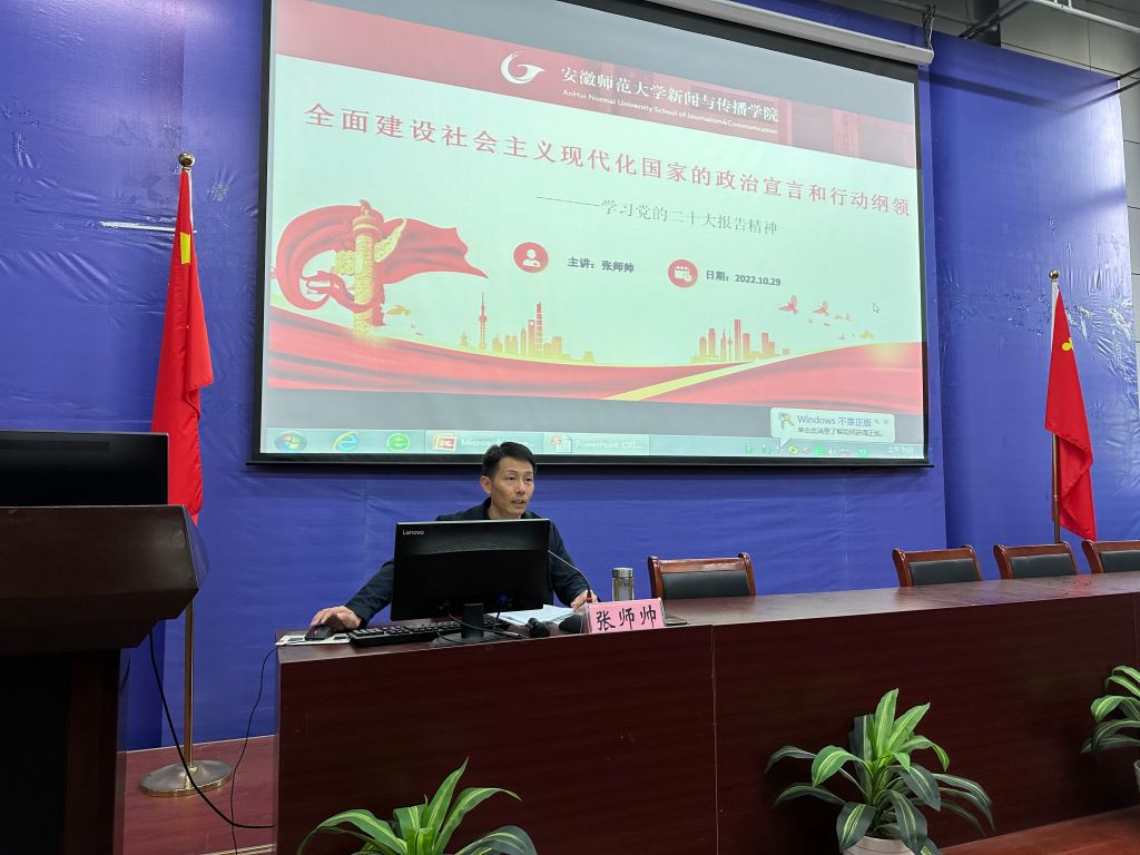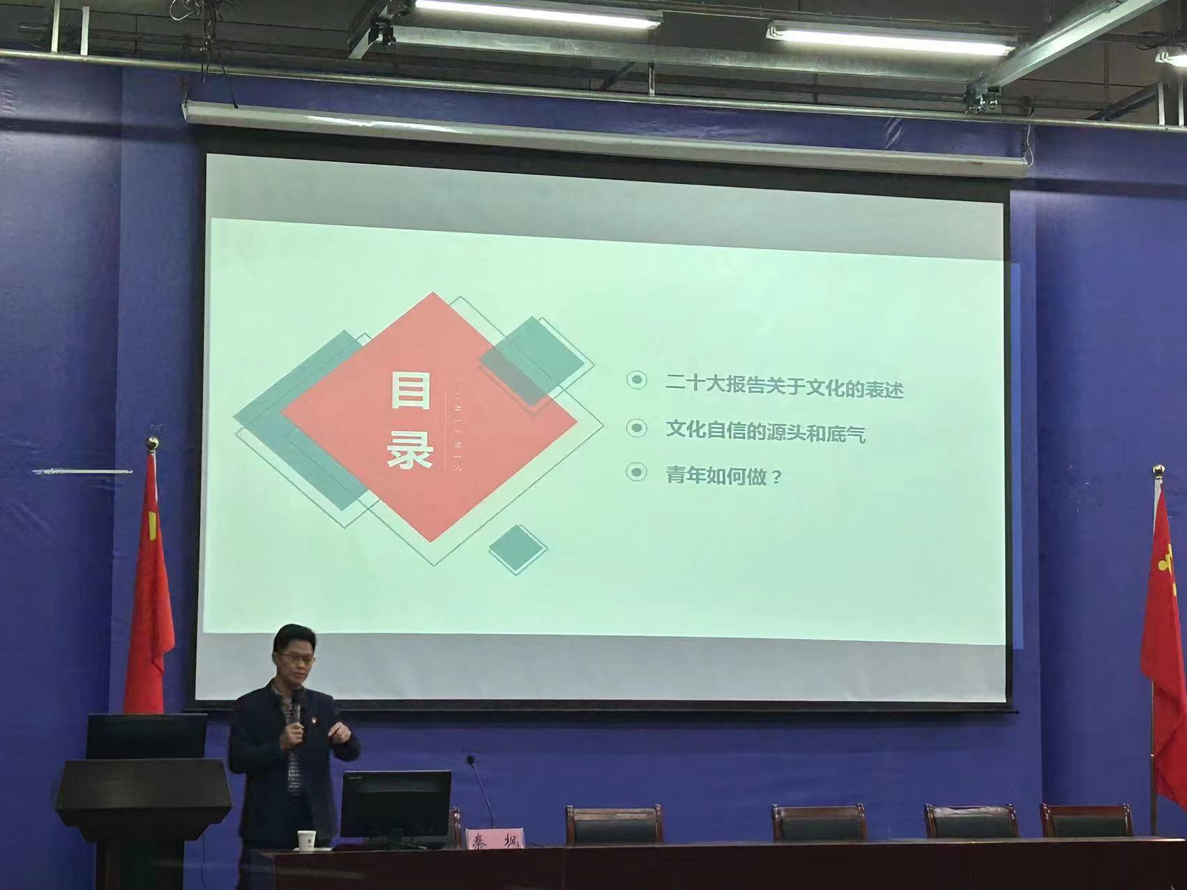 副院长秦枫以《文化自信自强与当代青年发展》为主题,为同学们讲授了党的二十大报告中关于文化自信的有关内容,引经据典地说明了文化自信的内容、要求、来源与底气,并强调,青年大学生尤其是未来传媒人要积极推进文化自信自强,铸就社会主义文化新辉煌,要把握好“输入与输出”两个方面的要求,客观对待文化输入,更要学习挖掘中华民族优秀文化,做中国优秀文化的有力传播者,并寄语同学们要拥有远大理想、热爱伟大祖国、担当时代责任、勇于砥砺奋斗、练就过硬本领、锤炼品德修养。
