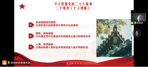 课上,杨柏岭带领同学们深入学习党的二十大精神,结合自己的学习体会和感悟,从深刻领会和把握大会主题、牢牢把握过去五年工作和新时代十年伟大变革的重大意义、牢牢把握习近平新时代中国特色社会主义思想的世界观和方法论、牢牢把握以中国式现代化推进中华民族伟大复兴的使命任务、牢牢把握以伟大自我革命引领伟大社会革命的重要要求、牢牢把握团结奋斗的时代要求以及党的二十大报告的其他创新点等多个方面进行了系统阐述和深刻解读,详细阐述了坚持党的全面领导是坚持和发展中国特色社会主义的必由之路、中国特色社会主义是实现中华民族伟大复兴的必由之路、团结奋斗是中国人民创造历史伟业的必由之路、贯彻新发展理念是新时代我国发展壮大的必由之路、全面从严治党是党永葆生机活力走好新的赶考之路的必由之路等内容。