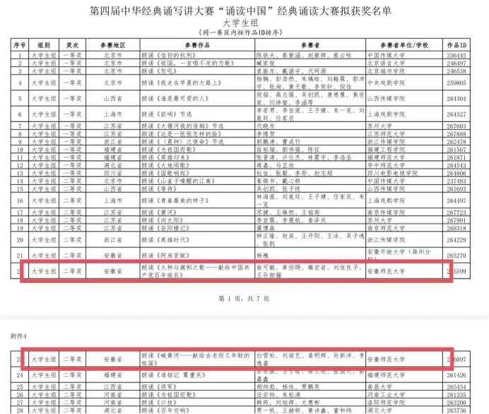 诵读古今经典,弘扬中国精神。为传承弘扬中华优秀传统文化,引领社会大众亲近中华经典,增强爱党爱国情怀,教育部、国家语委主办的第四届中华经典诵写讲大赛总决赛落下帷幕。bat365在线中国登录入口报送的朗诵作品《火种与旗帜之歌》和《喊黄河——献给古老而又年轻的祖国》经过省赛、复赛、全国半决赛,双双进入全国总决赛(全国共39部,安徽省3部),并双双获得大学生组二等奖。