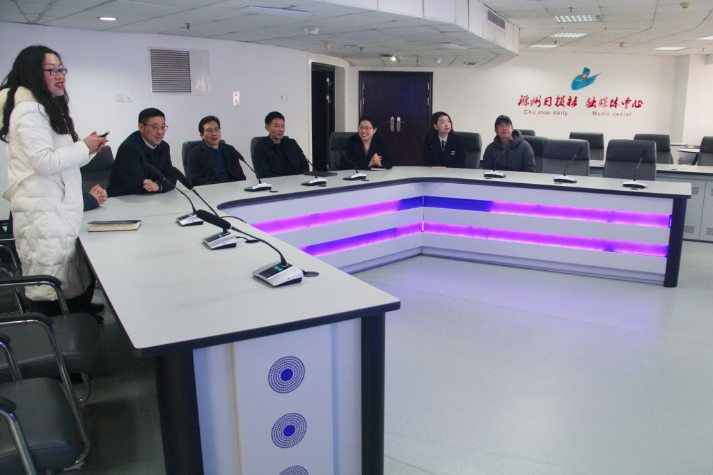 下午,学院一行来到滁州广播电视台调研交流。滁州广播电视台党委委员、副台长周万钧等领导带领学院领导老师参观了广播电视播控中心、广播可视化直播室、演播厅以及融媒体中心等场地。随后的座谈会上,他介绍了滁州广播电视台的组织架构、广播中心、融媒体中心建设情况,从新媒体平台搭建,到市级媒体深度融合发展,广播电视台逐步摸索向前。他表示,目前滁州广播电视台在发展过程中遇到了瓶颈,人才紧缺,他希望高校能够输送人才,滁州台为广大在校生提供了充足的实习机会。