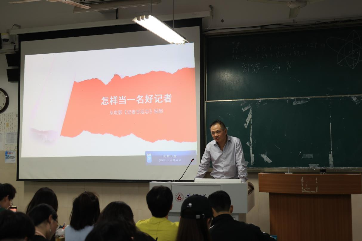 朱晓凯以幽默诙谐的语言向同学们介绍了记者这一神圣的职业,并分享了其从事记者工作的难忘经历,增进了同学们对记者的了解,也在潜移默化中影响同学们对于记者的印象。接着,他从电影《记者甘远志》出发,详细介绍了甘远志的生平事迹,在同学们心中树立了一个爱岗敬业、坚守职业道德的高大的记者形象,极大的感染和影响着同学们。朱晓凯从新闻记者锲而不舍的精神,“快”、“新”的新闻时效、新闻伦理分析三个角度讲述了一个记者应该具备怎样的道德品质和能力,以凯文卡特的《饥饿的苏丹》等事例和作品为例,详细阐述了以上三方面,培养同学们对记者职业能力和道德的认识。最后,朱晓凯批判了有偿新闻和有偿不闻现象,郑重强调了新闻记者的职业操守。同时,详细介绍了暗访这一采访手段,点明了“暗访能够最大程度地接近真相”这一重点。