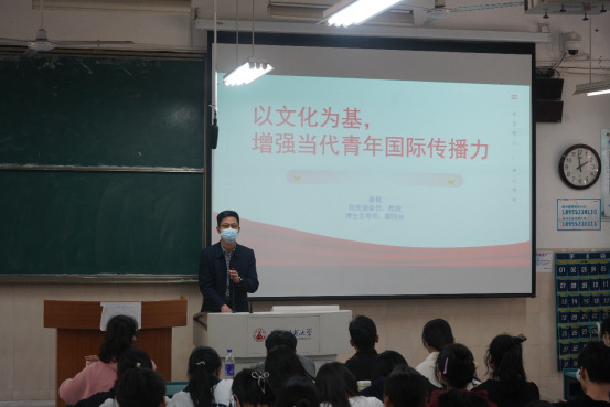 秦枫向同学们介绍了本次党课的主题——以文化为基,增强当代青年国际传播力,用生动活泼的语言,围绕主题选择、当前中国国际传播概况、党对国际传播的要求、当代青年如何做等四个方面进行了详细讲解。告诫同学们一定要认识到青年是整个社会力量中最积极、最有生气的力量。作为准备加入党组织的有为青年,要有”江山留胜迹,我为复登临”的磅礴朝气,要在自己的领域上传播好中国精神、中国价值,贡献出中国智慧、中国力量。