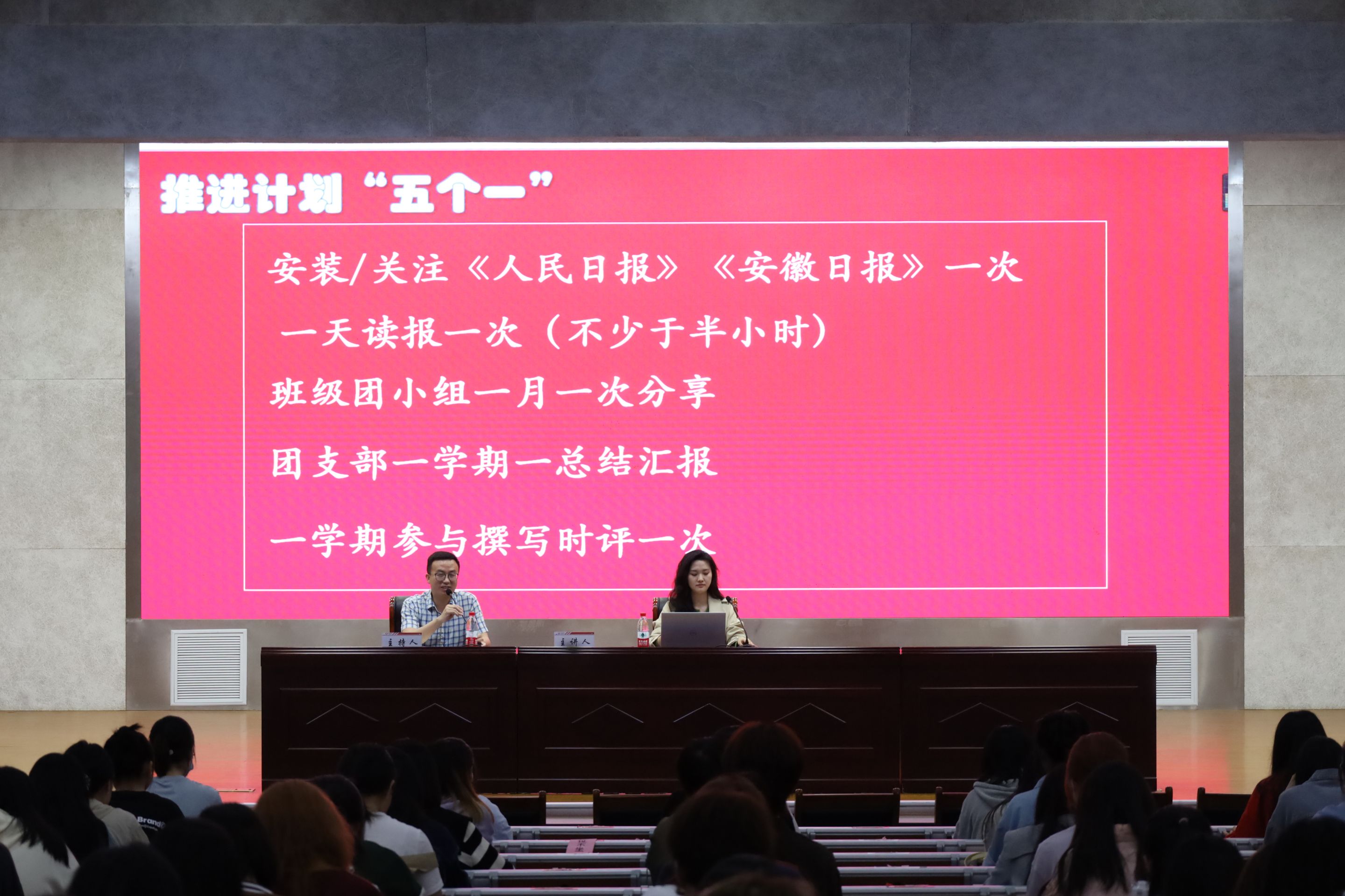 党报党刊是党和人民的喉舌,发挥着宣传党的理论路线方针政策的重要职责,是社会主义意识形态的重要阵地和传播社会主义先进文化的重要载体,也是高校不可缺少的思想政治教育优质资源。结合当前形势,李梦圆详细解读了学院“党报进校园”“五个一”活动安排,即安装并关注《人民日报》《安徽日报》一次、一天读报一次、班级团小组一月分享一次、团支部一学期总结汇报一次、同学们一学期参与撰写时评一次。