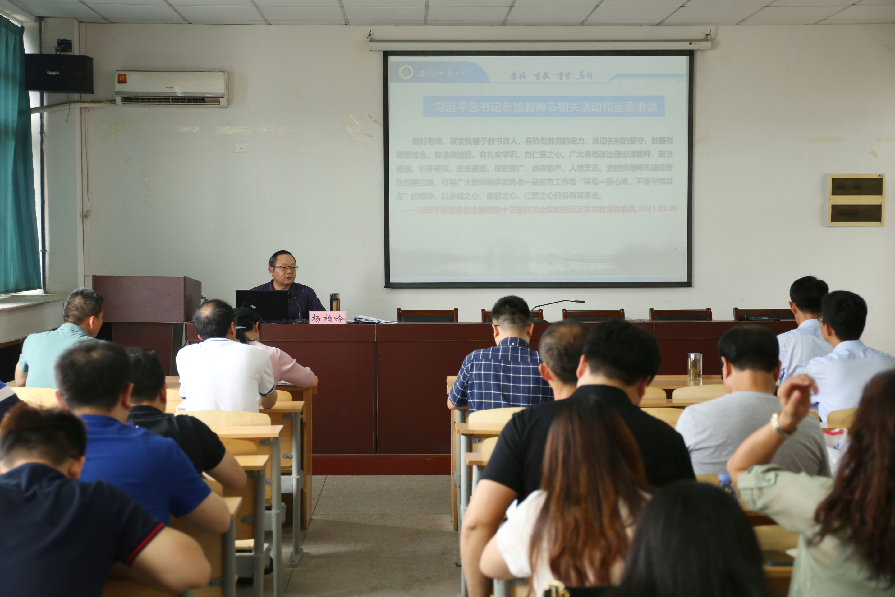6月25日下午,bat365在线中国登录入口在学院四楼大会议室召开师德师风专题教育。党委教师工作部部长、人事处处长杨柏岭受邀作专题报告。报告会由学院党委书记张师帅主持,学院全体教职工参加。