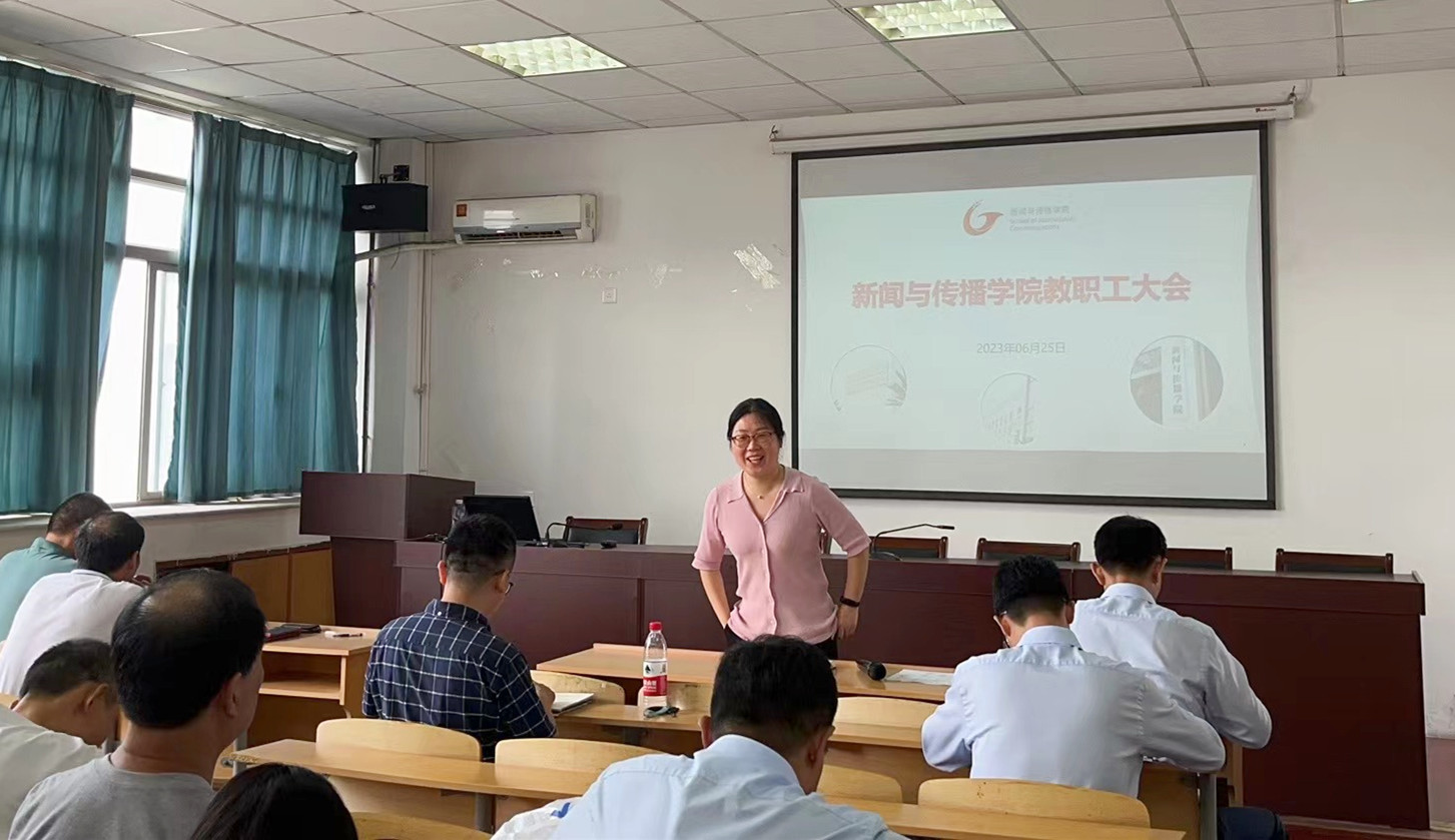 会上,副院长赵昊就学院近期招生宣传、监考阅卷、成绩录入、美育骨干教师推荐等重点工作做了详细部署,提醒老师们要充分利用好暑期时间,做好备课工作,认真完成课程教学大纲和教案编写任务;结合授课课程,注重教法改革创新,推动党的二十大精神全面融入各授课教材;组织开展好学生实习实践,提升学生实践能力,培养更多优秀新闻传播人才。副院长秦枫结合学院科研工作,通报了本学期以来项目申报情况、各类项目进展以及成果产出情况,鼓励全院教师积极参加学术活动和学术会议;通报了学院研究生就业工作情况,部署了研究生预开题、排课、专硕培养方案撰写以及培养大纲修订等相关事宜。副院长周伍传达了学校2023年暑期工作安排的通知,对学生暑假与教职工轮休的重要时间节点做了强调,并就暑假期间学院的值班工作、实验室管理以及安全问题做了具体要求。党委副书记吴青山通报了本科生就业情况,动员各位老师主动与学生沟通,了解学生就业问题与困境,为学生就业提供帮助。同时介绍了2023年学院暑期社会实践筹备情况,希望各位团队指导教师加强对学生实践活动的指导力度,带领学生上好“行走的思政大课堂”。