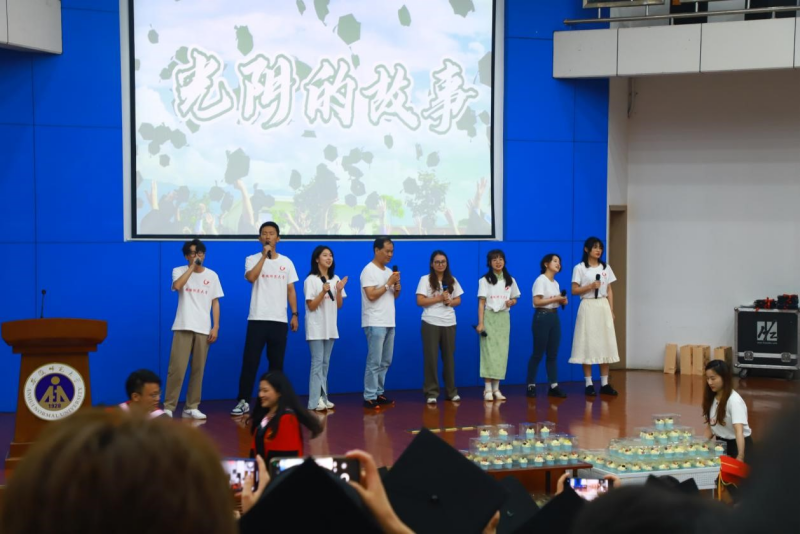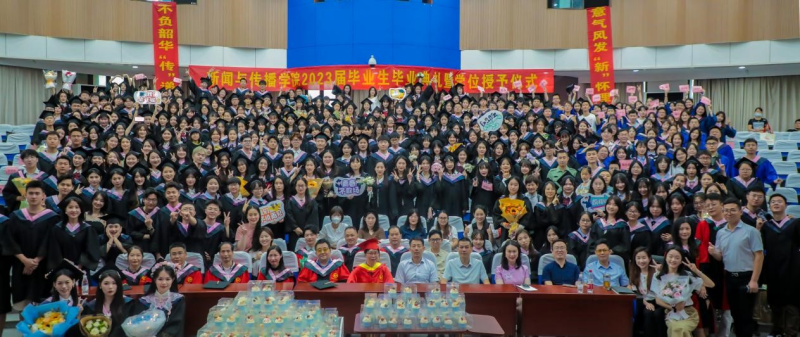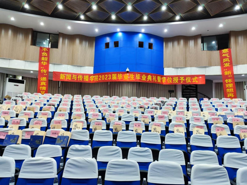 师生合力,办一场与众不同的毕业典礼。6月19日下午,学院2023届毕业典礼暨学位授予仪式在敬文报告厅隆重举行。毕业红毯、纪念门墙、特色签到桁架……精心布置的典礼现场温馨温暖。本次毕业典礼共分为四个篇章,除了有歌曲串烧,校友、家长、老师寄语等传统环节,还增加了具有学院特色的原创诗文朗诵、原创毕业视频、专题纪念视频与对话式表演等师生倾情创设的新颖环节。精心拍摄的采访、拼接了四年荣光的剪辑、承载了四年故事的诗词、包含了青春哲思的对话……在诉诸着离殇的曲调中,每一个创意节目的登场都令现场师生激动欢呼,更感受到本次毕业典礼背后学院师生的用心用情。2019级新闻学专业的刘紫仪是本次毕业典礼的主要负责同学之一,也是一名毕业生。谈及此次毕业典礼的筹备,她感慨到:“前后准备了两周的毕业典礼圆满落幕,老师们、同学们为这次典礼花费了很多心血。广告班同学设计的桁架展板、签到墙、打卡墙受到了大家的一致好评,马星宇老师从北京到安徽的高铁上写的诗歌让同学们泪目,物资组为大家精心准备的定制可乐和矿泉水、明信片、印章、蛋糕、特制礼袋等也让大家很是感动。”2019级网络与新媒体专业的肖欣雨表示:“筹备毕业典礼的老师和各班骨干特别辛苦,在我心里这是一场完美的毕业典礼了,我有个朋友刚好来找我,全程参加了学院毕业典礼的观摩,表示十分羡慕。”