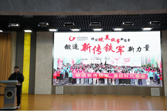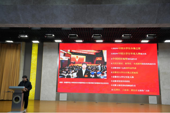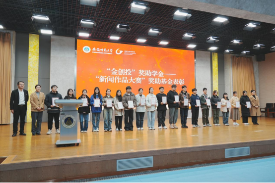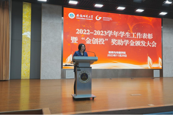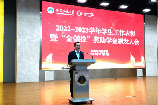 “续写皖美故事新篇章,锻造新传铁军新力量”。在首次“金创投”奖助学金的颁发仪式结束后,学院团委书记刘成俊、“校十佳大学标兵”获得者郭昊分别作了展示汇报,向参会嘉宾、师生代表展示学院“行走的思政课堂”实践育人工作开展情况以及学院首届新闻作品大赛开展情况。