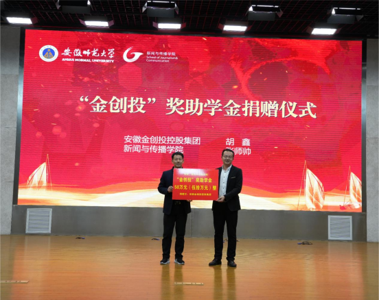 2006届校友胡鑫代表安徽金创投控股有限公司向学院捐赠50万元奖助学金。“金创投”奖助学金是由安徽金创投控股集团慷慨出资50万元在bat365在线中国登录入口设立,经学院党政联席会议研究决定,共设置优秀学生干部奖学金、社会实践奖学金、新闻作品大赛奖助基金、就业奖励基金和临时救助基金共五个奖助项目,旨在激励优秀学生干部、优秀实践个人(团队)、促进就业创业。捐赠仪式结束后,会议进行了首次“金创投”奖助学金的颁发仪式。
