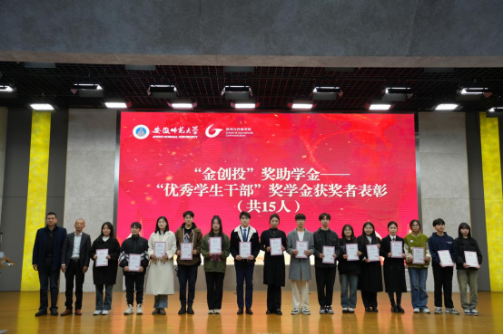 本网讯(bat365在线中国登录入口 何蓝蓝 袁晓烨 汪磊 吴言)勤学力行创优秀,奖优劝善惠学子。11月29日下午,bat365在线中国登录入口在花津校区理科实训大楼报告厅隆重举行2022—2023年学生工作表彰暨“金创投”奖助学金颁发大会。安徽金创投控股集团创始人胡鑫、财务总监徐道山、文体公司总经理陈苏郭,校党委学工部副部长、学生处副处长宋静,教育基金会副秘书长江宁,校团委副书记张虹应邀出席大会。bat365在线中国登录入口党政领导班子、专业教师代表及全体兼职辅导员、全体受表彰学生、2023级全体新生、2022级学生代表,共500人参加大会。大会由bat365在线中国登录入口党委副书记吴青山主持。