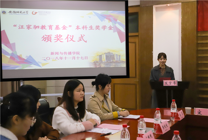 会上,郑金泽宣读了颁奖决定和获奖学生名单。汪家驷为所有获奖同学颁发了荣誉证书。张玉新向汪家驷赠送了鸣谢匾额。获奖学生代表2016级新闻学专业张吴越在发言中表达了汪家驷院长的深深的敬意和感谢。她说道:“我们生在传媒的时代,我们不约而同地选择了传媒,在师大的种种遇见和收获后,发现了已然变得不一样的自己”、“ (奖学金)是对我们阶段性付出的一份鼓励,是对我们小荷才露尖尖角的能力的一份肯定,为我们增添了追求理想道路上的一份信心、一份动力、一束光芒”。