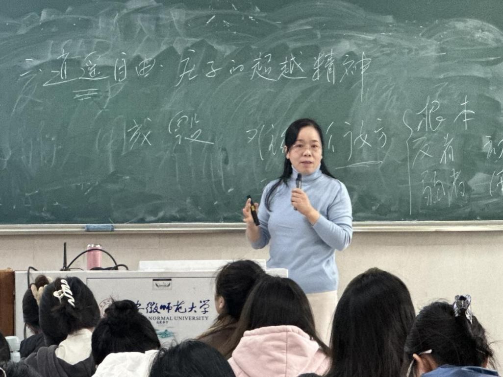 课堂伊始,王友群老师和同学们一起回顾了上一节课学习的老子思想,并指出虽同属道家,但老子和庄子的道论却存在同与不同,以此自然地切入本节课的主题“庄子对老子道论的接受与发展”。课堂上,王友群通过对《庄子》原典的解读,以“鵷雏之志”“鲋鱼之忿”“吮疽舐痔”“鼓盆而歌”等故事生动地诠释了庄子的形象。谈及庄子的道论,王友群老师不拘泥于《庄子》原典,注意结合当代学者的新知新见,便于同学们更深入地理解庄子的思想。在整个过程中,王友群老师以其丰富的情感、生动的讲述,饱满的课程内容深深地牵引着同学们的注意力。同学们专心听讲,认真记录,课堂氛围浓厚。