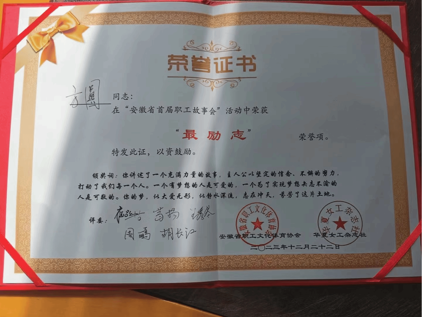 “铁肩担道义,妙手著文章”,方圆将这十个字放在故事的结尾,述说着主人公为新闻理想奋斗的经历,主人公坚定的信念、不懈的努力,打动了在场的每一个人,也赢得了现场评委的一致好评。最终,方圆在“讲好职工故事•建设美好安徽 ——安徽省首届职工故事会”决赛中荣获“最励志”荣誉。