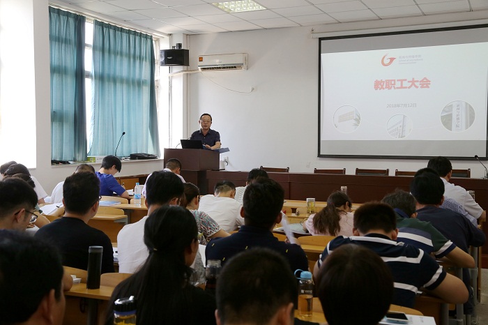 近日,bat365在线中国登录入口召开全院教职工大会,回顾总结本学期工作,部署暑期工作。学院领导班子及全体教职工到会,会议由院党委书记胡靖主持。