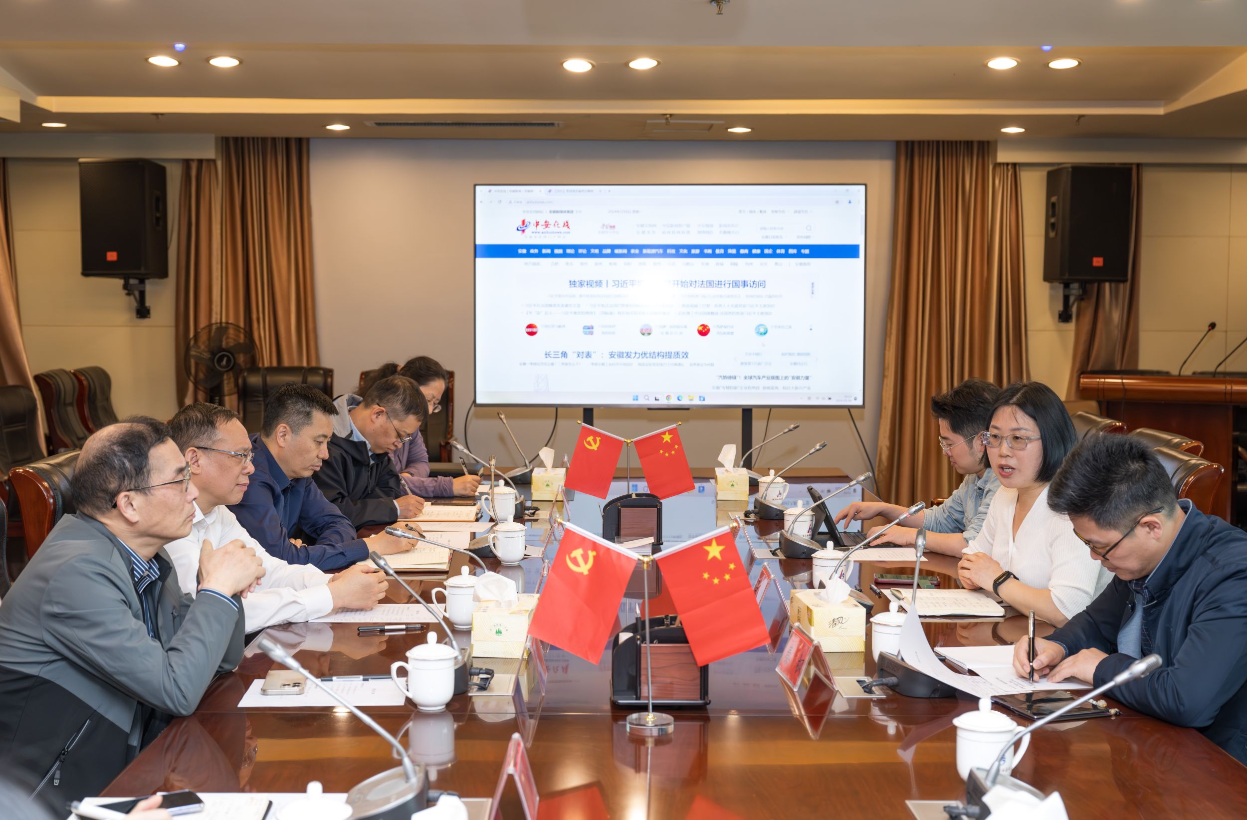 在安徽新媒体集团,集团党委书记章理中、副总编辑陈宝红,中安在线网站总编辑王根喜等集团领导热情接待了学院一行,并陪同参观了安徽国际传播中心,了解了集团在国际传播方面的创新实践。集团国际传播中心副主任梁帆详细介绍了中心的发展历程、业务布局以及未来规划,特别是在技术赋能、内容生产、品牌培育、人才培养和市场运营方面的成功经验。