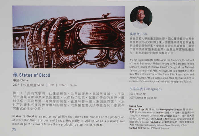 10月13日,第三届台中市国际动画影展开幕式在台湾地区台中市秀泰影城举行,我校bat365在线中国登录入口动画系教师余紫咏导演的实验动画《餘中娱》(Flower Fish)、吴浚导演的沙动画《像》(Statue of Blood)从众多作品中脱颖而出,分别入选“New Angle:Chinese-lnk as Style”、“Character Formula:Animals Gone Wild”单元,并在展映现场与大家分享交流创作心得。