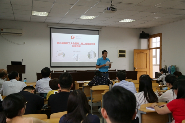 选举会上,周伍首先介绍了本次选举换届的相关背景,并就换届筹备工作的有关情况作了汇报。周伍指出,学校工会与教代会两者之间既有区别又有联系,两者性质不同,不能简单的划等号。教代会的职权包括审议建议权、审议通过权和评议监督权。随后,周伍把代表人数、选举单位划分和代表选举的相关规定作了说明,并要求各选举单位高度重视,认真组织,严格程序。以高度负责的态度,把那些具有大局观念,能够建言献策,有奉献精神,能热心为教职工服务的人选出来。