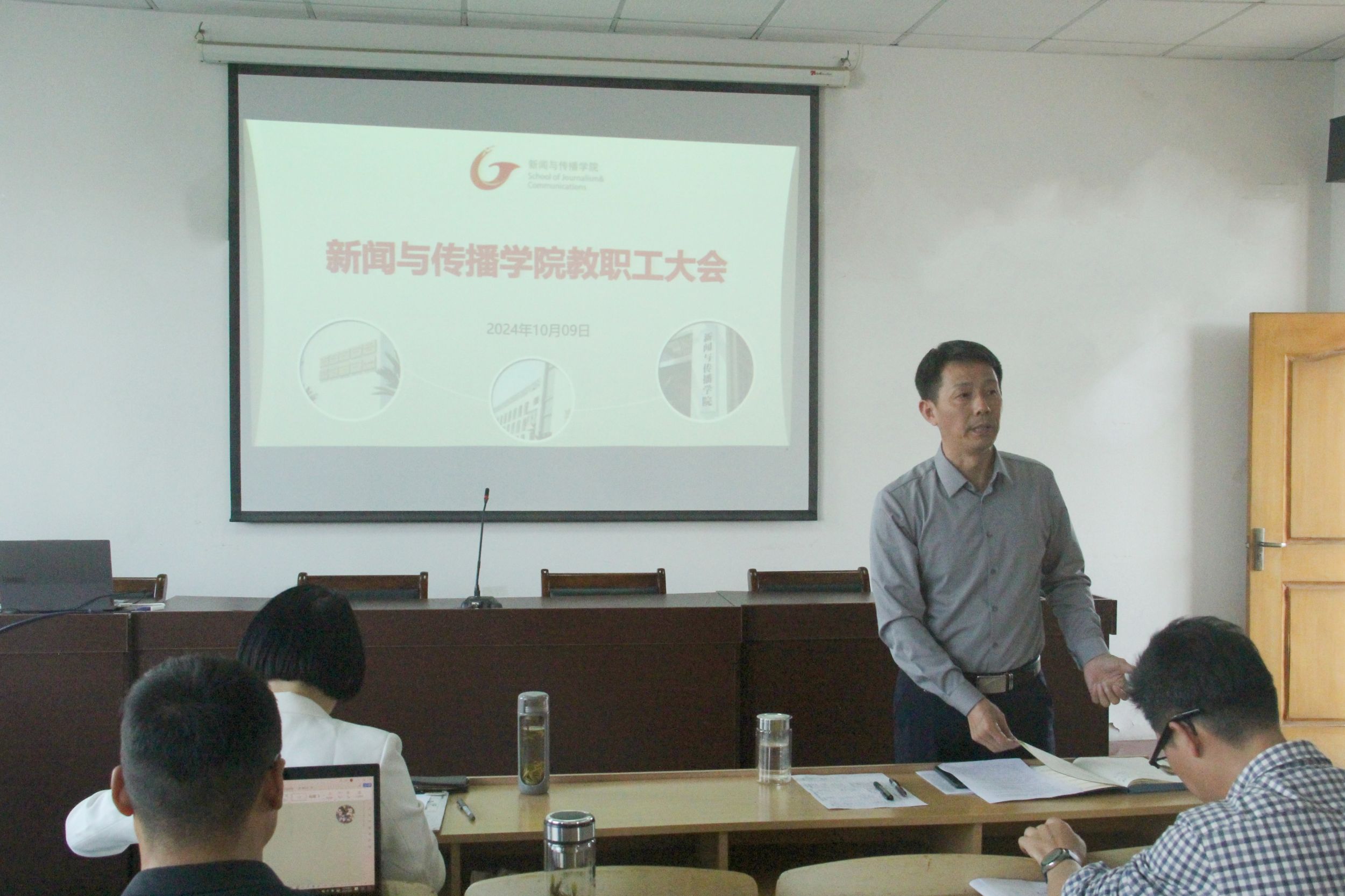 10月9日下午,bat365在线中国登录入口在学院楼405召开全院教职工大会,进行集中学习、院情通报和工作部署。会议由院党委书记张师帅主持,全体教职工参加会议。