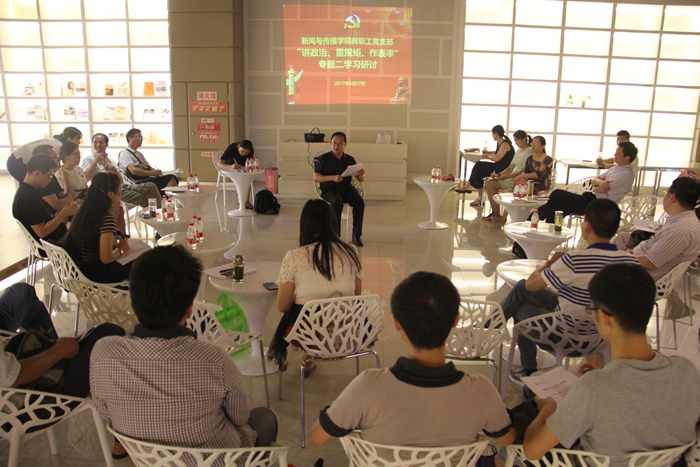 6月28日下午,结合“两学一做”第二专题学习教育“讲政治、重规矩、作表率”,学院党员再次展开了深入讨论。各位党员围绕“讲重作”分享了自己对师德师风、科学道德的看法。党员们表示要自觉实践理想信念做合格党员教师,并立足本职岗位,强化规矩意识,坚持把立德树人作为中心环节,在教育教学的全过程彰显师德师风。执行院长、新闻与播音党支部的杨柏岭老师从“人品、特长、贡献”三个维度深入分析了人才的要求和规矩在人才培养与发展中的重要性。院党委书记、广告与文管党支部的胡靖老师作总结讲话时,用“学院发展再发力、科学发展再认识、重规矩再落实”三句话进行了总结。他指出,在部校共建的背景下,“重规矩”对学院取得更新更好的发展尤为重要,必须是人人有关、人人有责、人人有用,要求全体党员教师牢记规矩,更新思维观念、做好科学决策,使部校共建新闻学院取得长足进展。