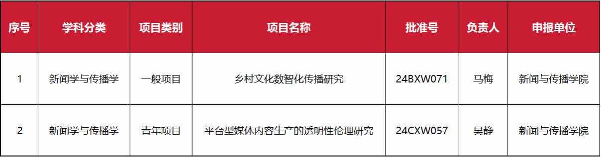 获批项目中,学院马梅教授主持的“乡村文化数智化传播研究”获国家社会科学基金一般项目资助,青年教师吴静主持的“平台型媒体内容生产的透明性伦理研究”获国家社会科学基金青年项目资助。