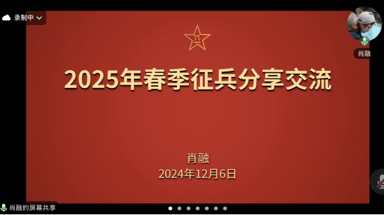 为做好2025届就业指导服务工作,帮助大学生全面了解征兵政策,激发入伍热情,12月6日晚,bat365在线中国登录入口召开2025届毕业生征兵宣传会议。学院本科生辅导员、中国人民解放军联勤保障部队退役军人汪笑笑,2024级新闻学专业本科生、中国人民解放军火箭军退役军人肖融应邀作专题分享。院党委副书记吴青山、2025届毕业班全体辅导员、2025届毕业班学生参加会议。会议由刘成俊主持。