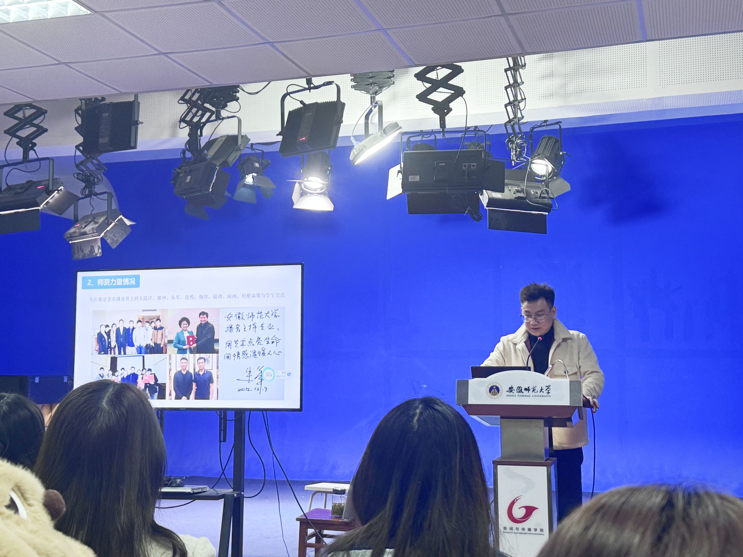会议伊始,王旭作为主持人,简要介绍了邵振奇的专业领域、学术背景及获奖等情况。随后,邵振奇以“厚基础、强实践、重创新”为核心,系统阐释了播音与主持艺术专业的培养框架。他提到,专业始终以“声韵为媒,匠心为魂”为指引,通过模块化课程与进阶实践体系,助力学生成长为兼具人文底蕴与专业技能的复合型人才。