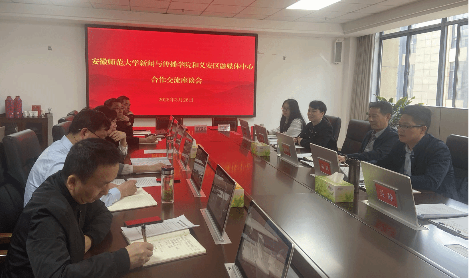 为提升新闻传播专业人才培养水平,深化校地合作与媒校联动,切实培养兼具实践能力、创新精神和跨学科素养的高素质人才,3月26日上午,学院党委书记张师帅、副院长秦枫以及网络与新媒体专业主任林燕一行赴铜陵市义安区融媒体中心进行交流并签订实习实训基地共建协议。