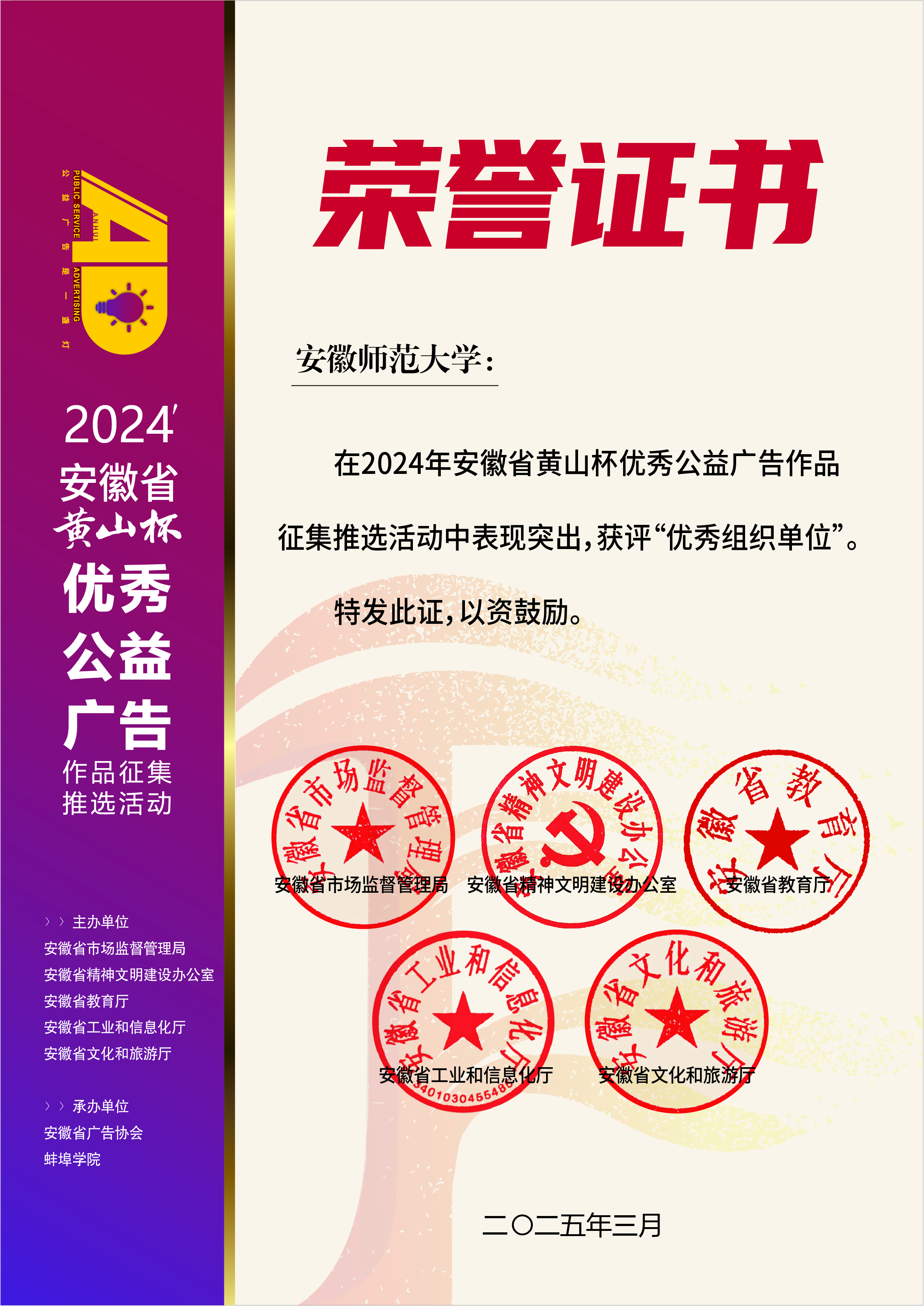 近日,由安徽省市场监督管理局、安徽省精神文明建设办公室、安徽省教育厅、安徽省工业和信息化厅、安徽省文化和旅游厅共同主办的2024年安徽省“黄山杯”优秀公益广告作品征集推选、商业广告创意大赛获奖名单公布。我校15件作品脱颖而出,斩获奖项,其中公益类10件(含等级奖1件)、商业类5件(含等级奖1件)。同时,我校荣获“优秀组织单位”称号,展现了师生在创新实践领域的积极投入。