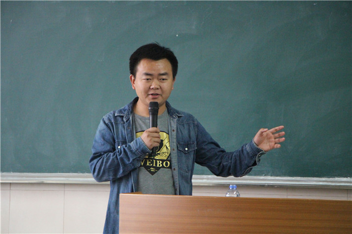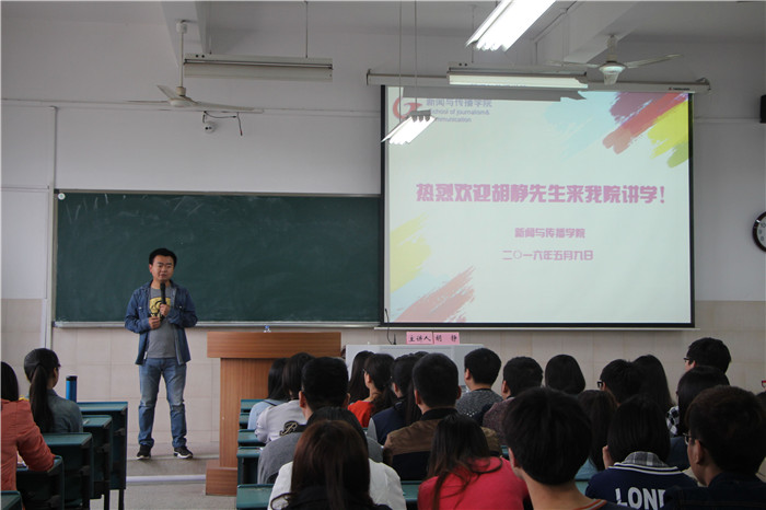 讲座开始后,胡静先引导同学们讨论不同时代的网络热词,由此窥见从互联网到移动互联网的时代发展。接着,他讲述了从1.0门户时代到4.0众媒时代的变迁,分析了当下网络媒介载体的多元化现象。他由直播现象为例,告诫同学们不要局限对媒体和媒介的概念认知。他认为搜狗、陌陌 、美图秀秀等平台甚至个人的微信、微博账号都可以被称为媒体。他强调如今的媒体和媒介正在不断外延与无限扩大,能把信息传播出去的东西就是媒介。