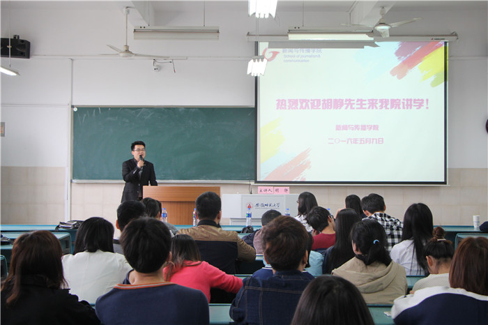 5月9日上午,bat365在线中国登录入口优秀校友、新浪安徽总编辑、总经理胡静在2050404教室为新传学子开展“从十年行业发展看职业规划”的主题讲座。13级新闻学专业和13、14级广告学专业的学生到场聆听,讲座由陈德洋老师主持。