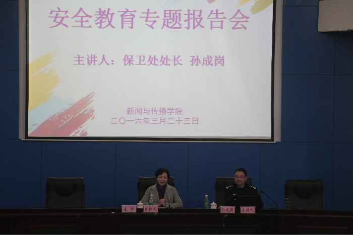 会上, 孙成岗从自己多年的工作经验出发,结合近期发生的校园重大安全事故的鲜活案例,从校园暴力、交通安全、财产安全、食品安全、消防安全、溺水事故、宿舍和实验室安全八个方面对学生进行安全教育。孙成岗主要采用举例子的形式,从校园暴力开始讲起,就校内校外的多起打架斗殴事件以及新形式的恐怖事件告诫大家冲动的危害。交通安全上,孙成岗提醒大家要注意校内校外交通安全,乘坐合法车辆,遵守交通规则。财产安全、食品安全他通过大量真实案例告诫同学们要时刻注意人身安全,保护贵重物品。在谈及财产安全时,孙成岗说“学生宿舍、食堂、图书馆、教室、运动场,都是偷盗事故的多发区,其中电脑和手机被偷的居多,因而生活中我们应该注意防盗、防骗,贵重物品不用时锁在安全地方,用时尽量带在身边。”而网络诈骗也是需要重点注意的地方,老师同学都有被骗的案例,孙成岗表示不要轻易相信网络的金钱交易,尤其要注意网络兼职、网络购物中要注意人身、财物安全。饮食方面,外出用餐要到有资质、卫生的餐馆,不要去没有营业牌照的大排档、路边摊用餐,多在校内就餐,以防食物中毒,造成生命危害。宿舍安全对于每一个在校学生来说都尤为重要,孙成岗提醒各位同学,在寝室中不要乱拉电线、不用电时要随时断电,严禁使用违禁电器,注意消防安全。安全面前不能存有侥幸心态,安全无小事,安全是对自己的生命安全负责,也是对他人生命安全的保护。最后,孙成岗向同学们展示了近年来校园案件数据统计情况,并提出了相应的应对措施:校园防盗十点安全提示,网上交友慎重三思。真实的案例和具体建议有利于进一步强化同学们的安全意识和纪律规范,增强平安校园创建、人人有责、重在预防的自觉性。