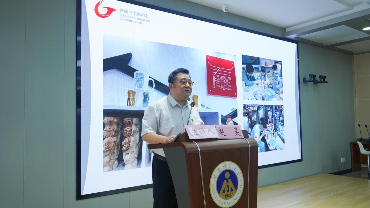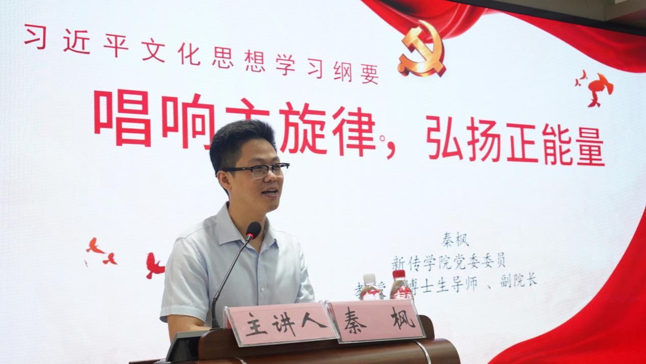 随后,学院党委委员、科研与研究生副院长秦枫以《习近平文化思想学习纲要》为核心内容进行授课。他详细地阐述了习近平文化思想的核心要义、精神实质、丰富内涵以及实践要求,并结合当前纷繁复杂的舆论环境,揭示了数智时代文化传播以及舆论引导的重要性。