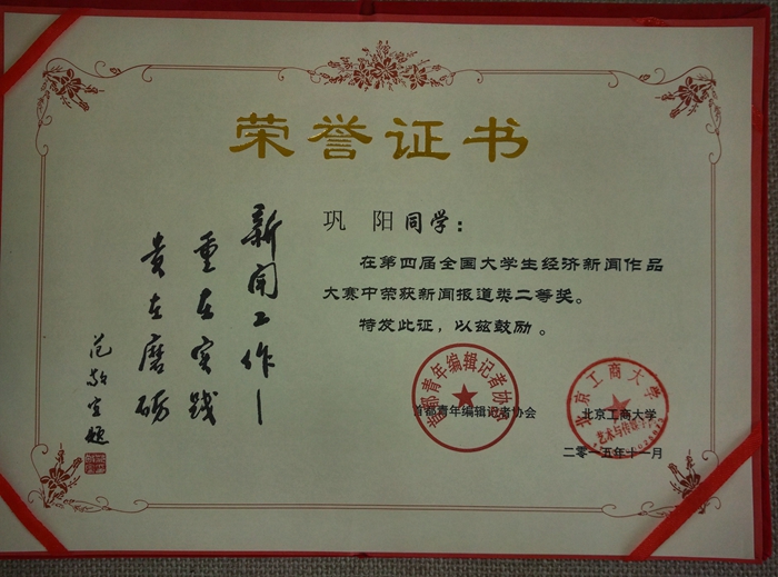 近日,在北京落下帷幕的第六届全国经济新闻改革与发展研讨会暨第四届全国大学生经济新闻作品大赛上,bat365在线中国登录入口新闻学专业2011级本科生巩阳的作品《解密铁路基金:三大国有行为完成政治任务不得不认购》获得新闻报道类二等奖,学院获得大赛优秀组织奖。
