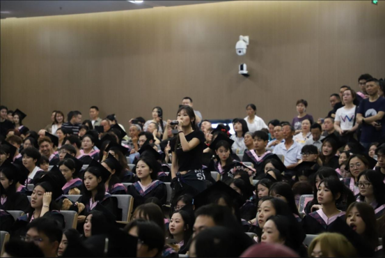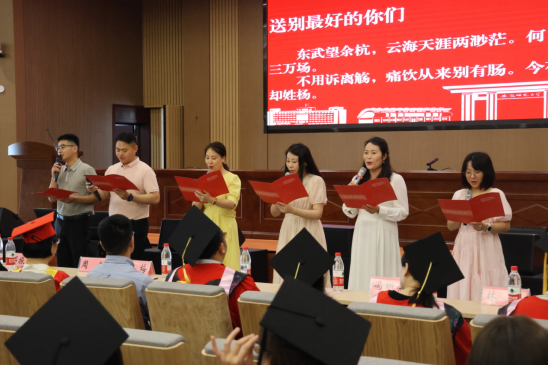仪式尾声,师生共同演绎《送别最好的你们》,学生代表李奇领唱,张荻、刘成俊等教师朗诵送别词,“竹杖芒鞋轻胜马,谁怕?一蓑烟雨任平生。” 豪迈的毕业祝福回荡在会场。