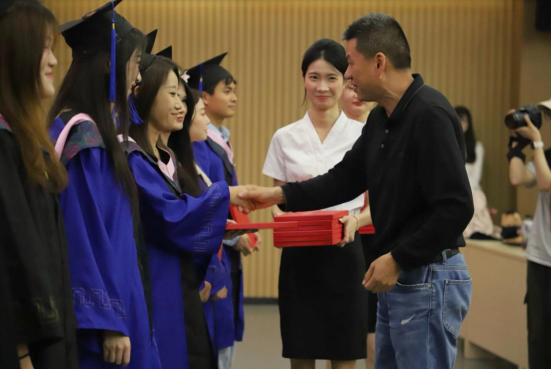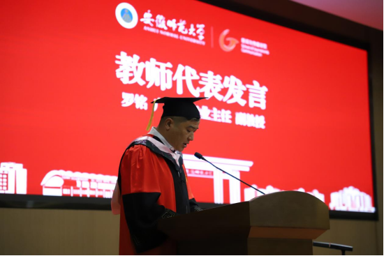 第二篇章“在你的沿途鼓掌”播放教师祝福视频《在你的沿途鼓掌》,老师们用幽默与温情的话语传递嘱托,“愿你们既有‘铁肩担道义’的担当,也有‘坐看云卷云舒’的豁达”。广告学专业主任罗铭作为教师代表发言,以“进取心、感恩心、敬畏心、平常心”四颗“心”为路标,叮嘱毕业生在技术迭代的时代“保持对知识的渴望,用人文情怀去丈量时代精神的海拔”。