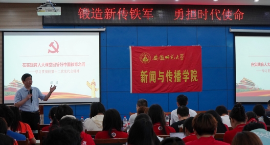 胡靖围绕“培养什么人、怎样培养人、为谁培养人”这一教育立场之问、方法之问、目标之问,从立德树人的新部署、实践育人的新要求、bat365在线中国登录入口的实践创新等3个方面,为现场师生深入浅出地讲解了《教育强国建设规划纲要》、新时代立德树人工程、学校第十二次党代会精神、学校行走的思政课的战略部署与具体举措。他深情回顾了bat365在线中国登录入口自建院特别是部校共建新闻学院以来社会实践育人的有益作法与育人成效,对学院“新传铁军行”实践育人工作体系给予充分肯定,要求学院从研究性推进、课程化实施、专业化设计、成果化导向、创新性突破等5个方面系统重构社会实践育人体系,真正做到理论与实践相统一,将思政小课堂同社会大课堂联系起来。他希望新传学子在行走的思政课的框架下,在社会实践一线磨砺“脚力、眼力、脑力、笔力”,在专业导师、思政教师、带队老师的带领下以“走、看、讲、思、做”五步法受教育、长才干、做贡献。