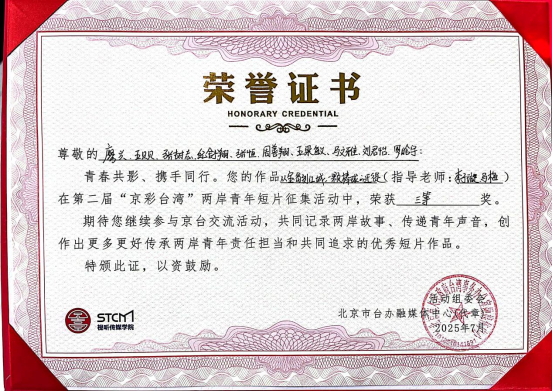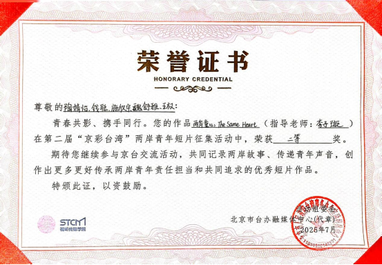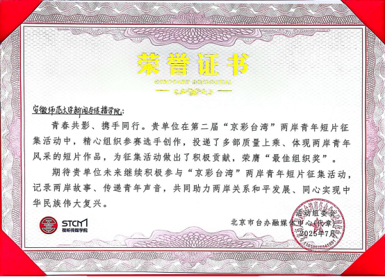 bat365在线中国登录入口教师马梅、李子璇指导的学生作品获得大赛多个奖项,学院获得了大赛组委会授予的“最佳组织奖”。学生陶婧怡等创作的作品《两岸童心The Same Heart》荣获第二届“京彩台湾”两岸青年短片征集大赛二等奖,学生廖兴等创作的作品《从宝岛到江城,一颗棒球的迁徙》荣获三等奖,学生茅文颖等创作的作品《心安是归处》荣获优秀奖。
