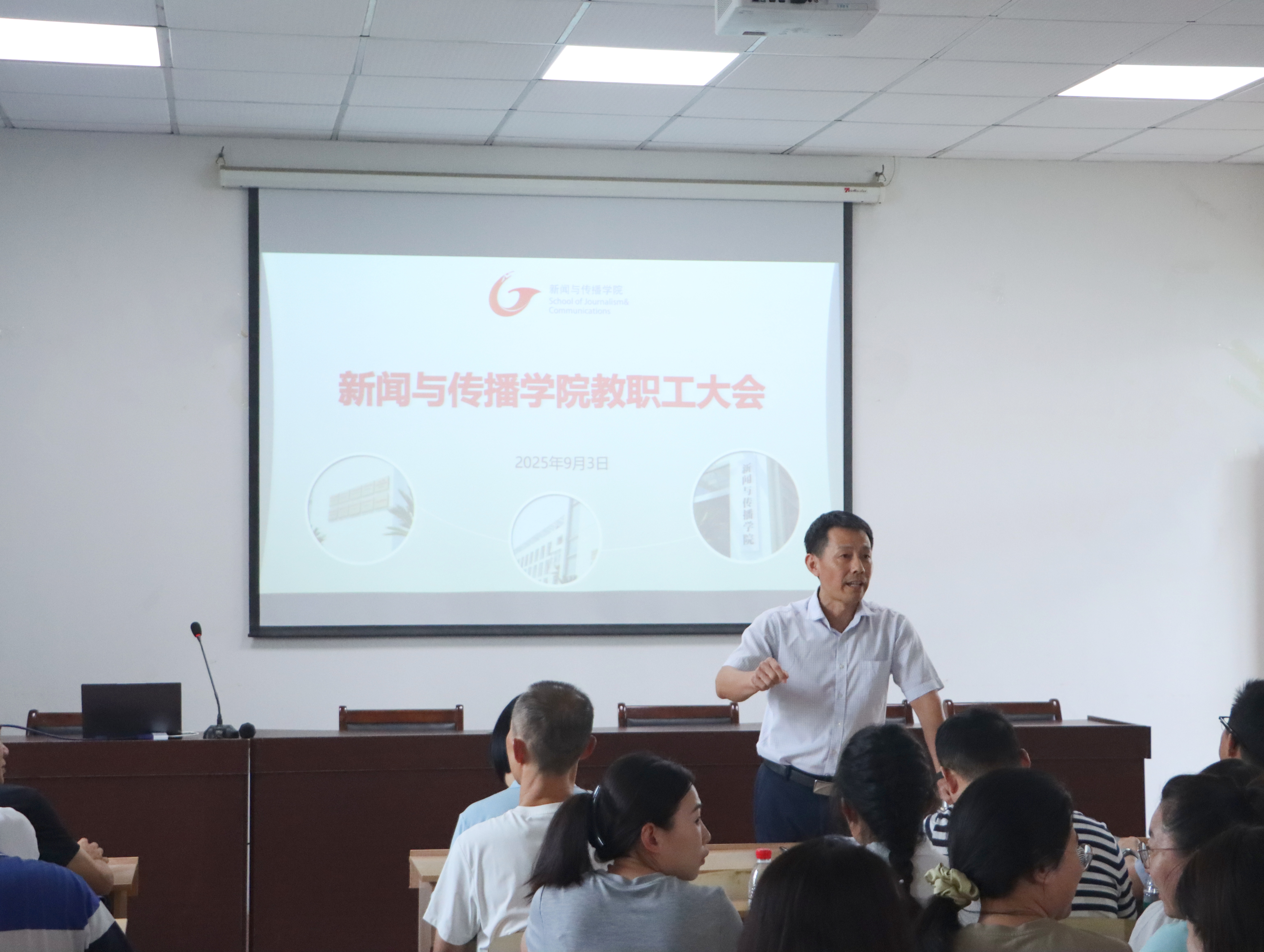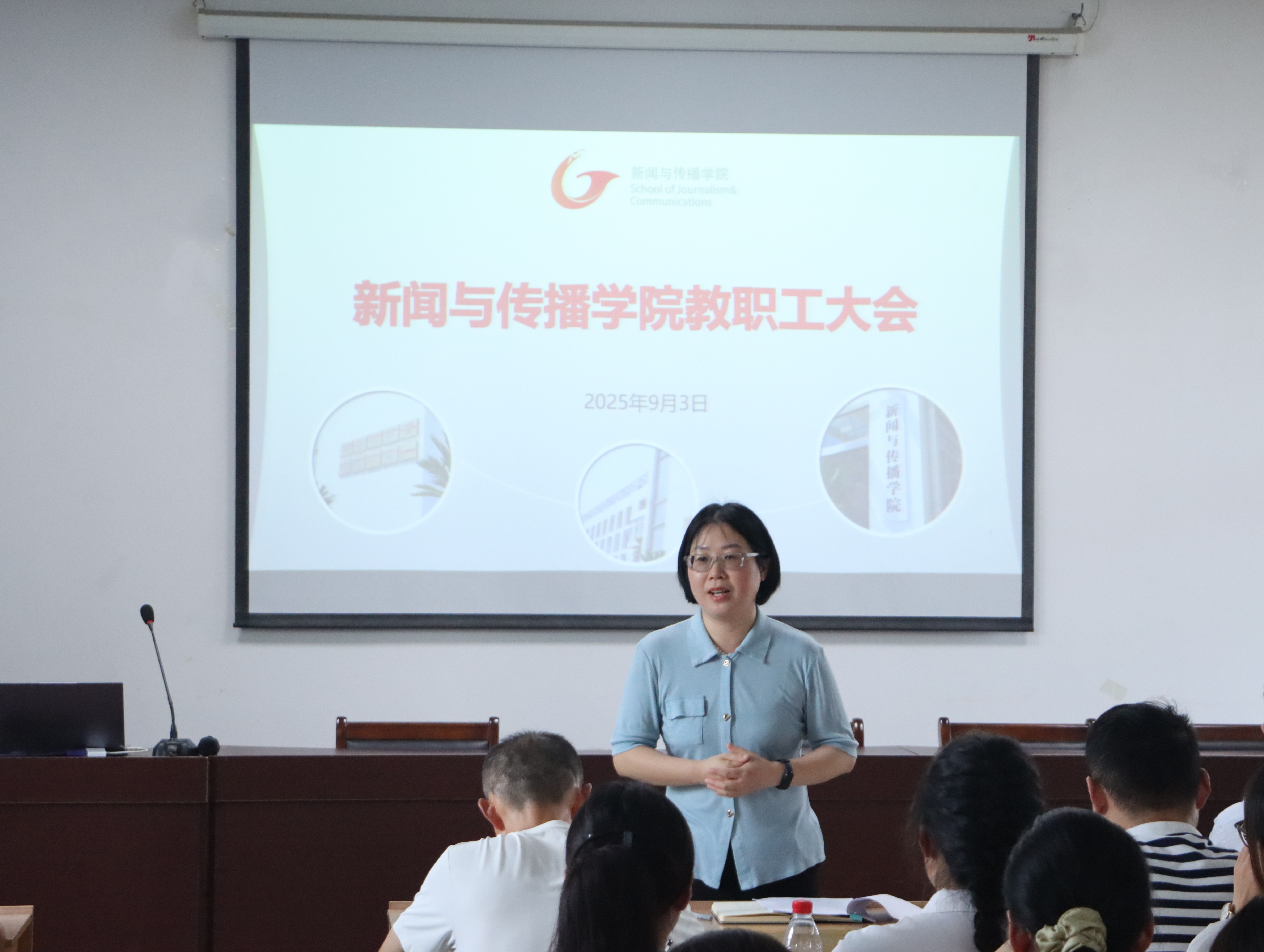 随后,执行院长马梅全面总结了学院2025年上半年在党的建设、人才培养、科研创新及学团工作等方面取得的显著成效,包括课程思政改革持续深化、教师教学创新大赛荣获省级一等奖、学生实践作品获主流媒体刊发百余次等亮点;同时明确了下半年重点工作部署,强调将持续强化思想政治引领、推动党建与业务深度融合,着力提升本科与研究生教育教学质量,进一步优化学科布局与科研创新机制,并扎实推进校园安全建设。她特别鼓励教师积极参与各类教学竞赛,主动运用AI技术辅助教学,持续提升教学创新能力,将数智传播、人工智能等前沿知识有机融入课程设计,加强产学研协同育人,不断促进人才培养与社会需求之间的紧密衔接,全面助推学院实现内涵式高质量发展。