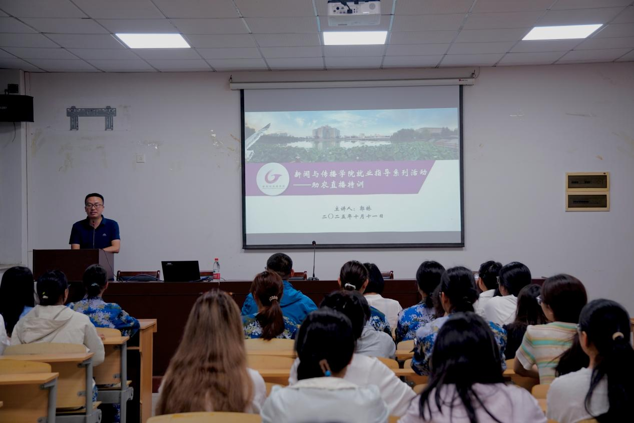 在就业指导环节,郭林针对“师大助农,平铺有礼”大学生直播大赛参赛团队,结合自身实战经验,从直播准备、产品分析、话术设计,到状态调整、违禁词规避、网络环境保障等方面,系统讲解了直播实操要点,帮助学生提升实战技能,增强就业与创业能力。