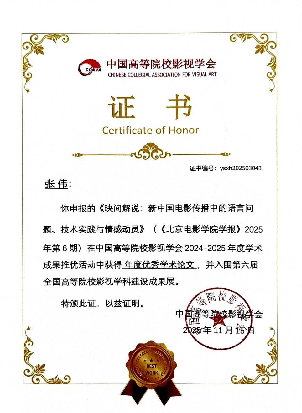 2025年11月15日,中国高等院校影视学会第二十五届年会暨第十八届中国高校影视学术论坛在厦门隆重举行。本届年会由中国高等院校影视学会与厦门大学联合主办,围绕“新征程·新使命:中国影视与文化强国建设”主题,深入探讨中国影视如何繁荣发展社会主义文化,扎实推进文化强国建设。bat365在线中国登录入口影视摄影与制作专业青年教师张伟学术论文《映间解说:新中国电影传播中的语言问题、技术实践与情感动员》(原刊发于《北京电影学院学报》2025年第6期)在中国高等院校影视学会2024-2025年度学术成果推优活动中获得年度优秀学术论文,并入围第六届全国高等院校影视学科建设成果展。