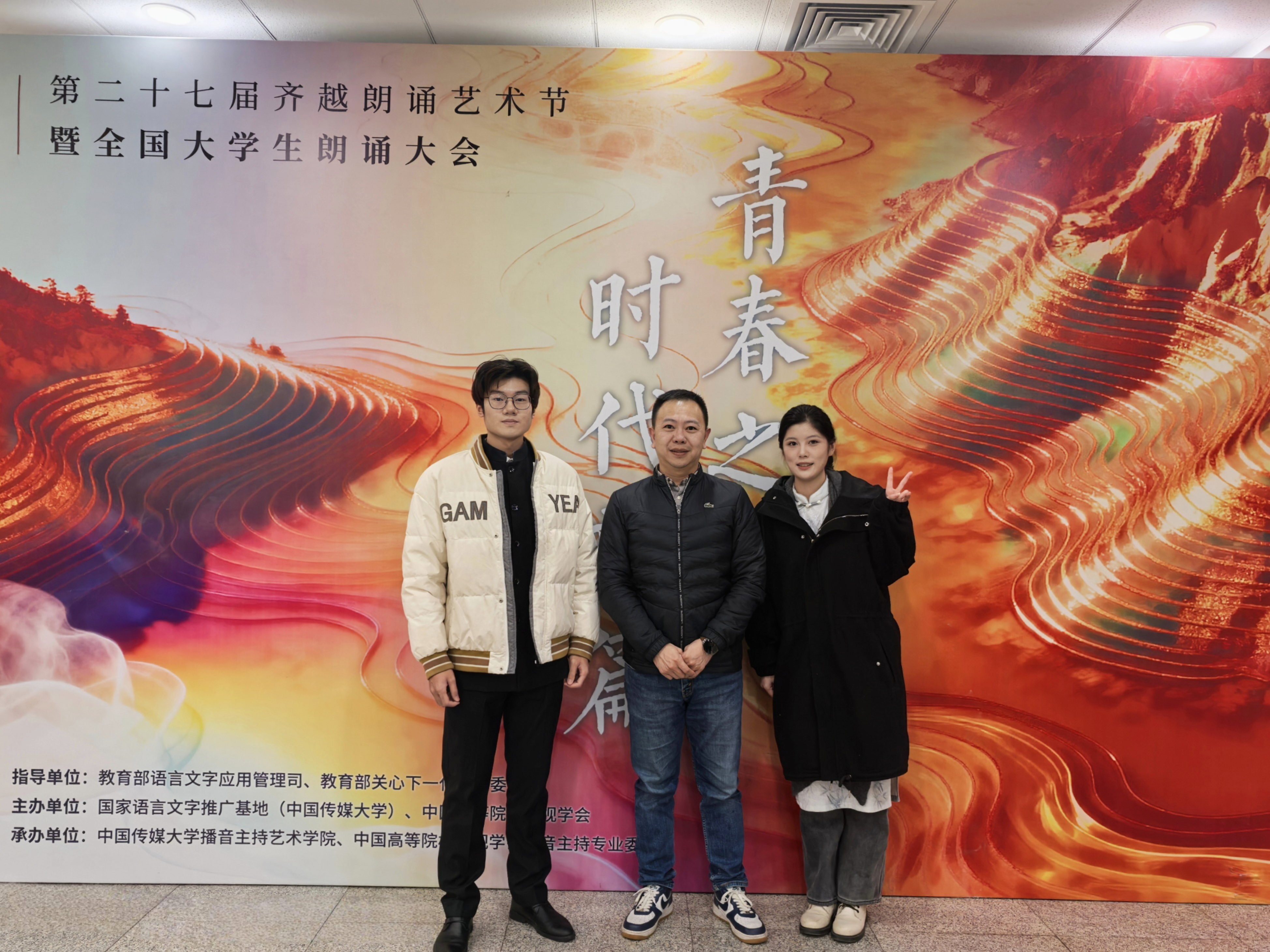 2025年11月17日,第27届齐越朗诵艺术节暨全国大学生朗诵大会全国复选在中国传媒大学中传讲堂上演。作为中国播音主持艺术领域极具影响力的国家级赛事,本届大会汇聚了全国数百所高校的顶尖朗诵人才。bat365在线中国登录入口播音与主持艺术专业选派的两名学子江舒娴与胡宇昂,在专业教师孙炜峰的带领下,登上全国复选舞台,与众多优秀选手同台切磋,以稳健的发挥和富有感染力的表现,圆满完成了比赛任务并获得优秀作品奖。
