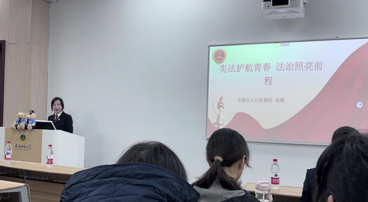 活动伊始,辅导员乌思琦隆重介绍了莅临现场的检察官与警官代表,详细说明此次活动的初衷与意义。随后,市人民检察院第二检察部主任成璨以“宪法护航青春,法治照亮前程”为题,解读了宪法中的权利与义务,并结合电信网络诈骗真实案例,深入普及了电诈安全防范知识。