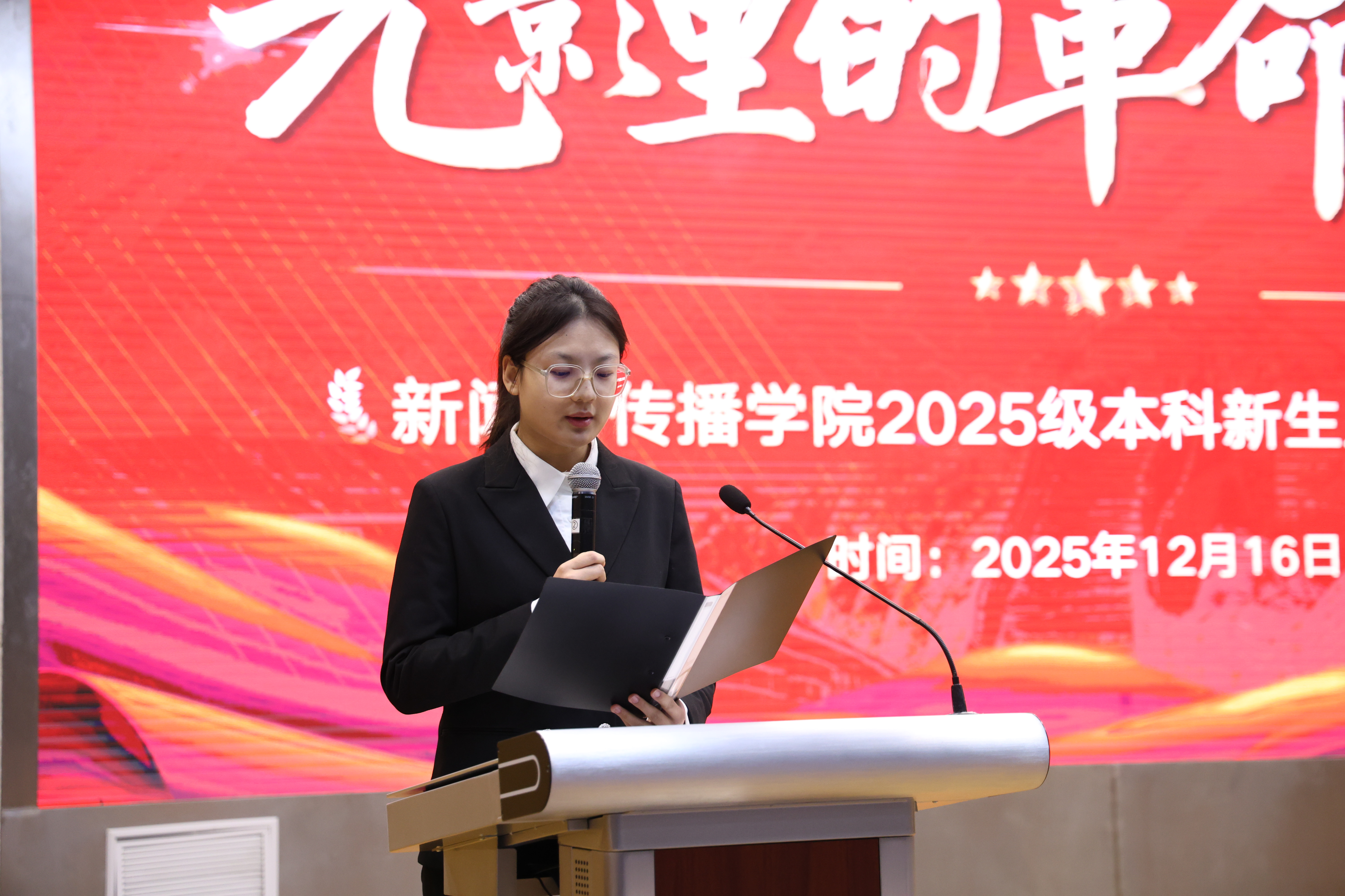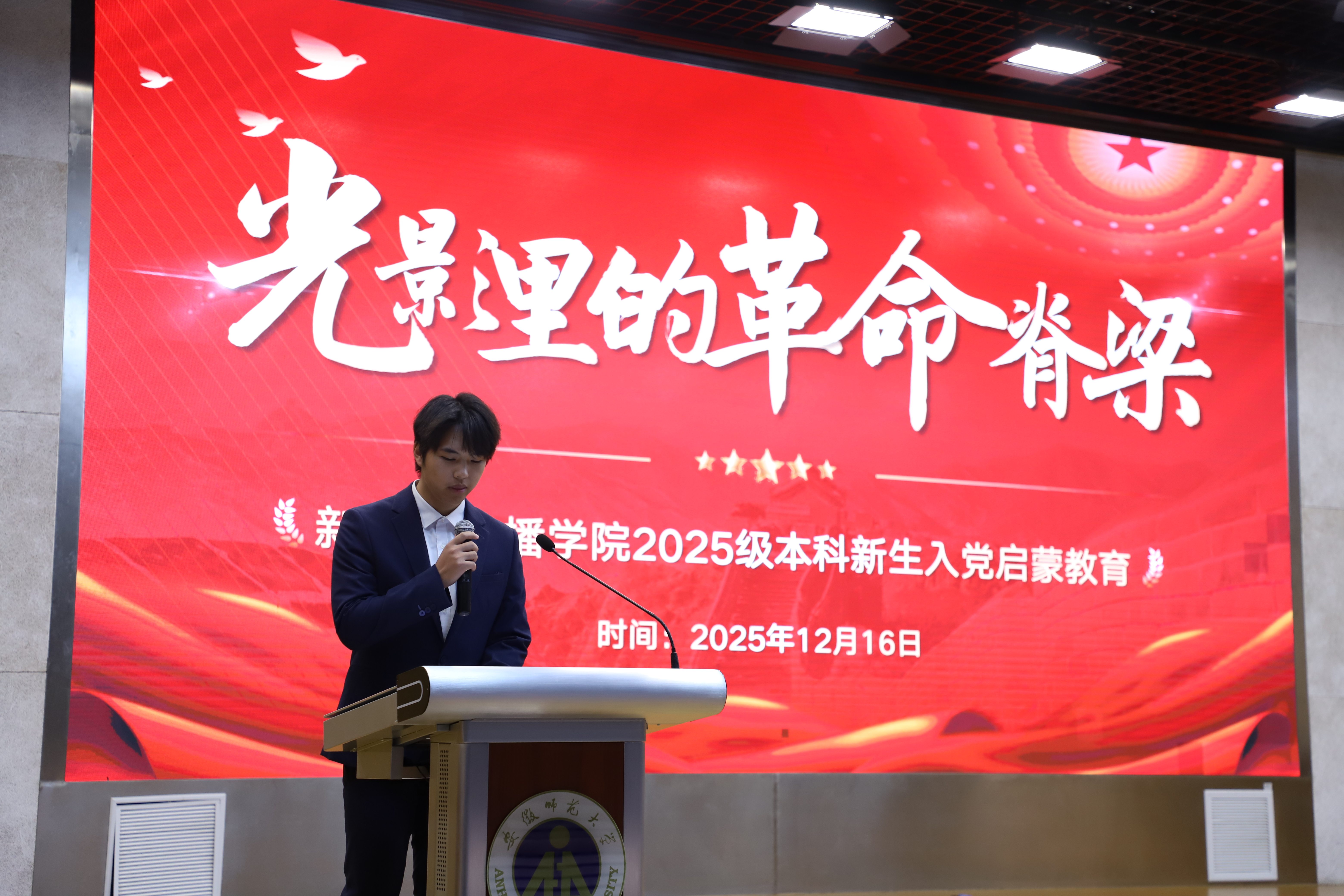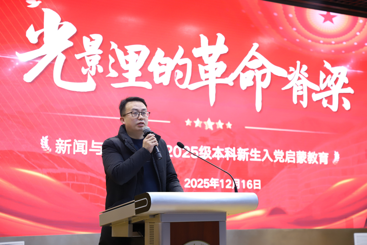 本网讯(bat365在线中国登录入口 文/张傲雪)为加强2025级本科新生对中国共产党的认识、筑牢理想信念根基,12月16日晚7时,bat365在线中国登录入口在理科大楼报告厅举办“光影里的革命脊梁——2025级本科新生入党启蒙教育”活动。院党委副书记吴青山、团委书记刘成俊、辅导员汪笑笑、郑慧玲、郭锦怡和第70期入党积极分子培训班全体学员、2025级全体本科新生参加了活动。活动由2022级播音与主持艺术专业学生党员叶凌志主持。
